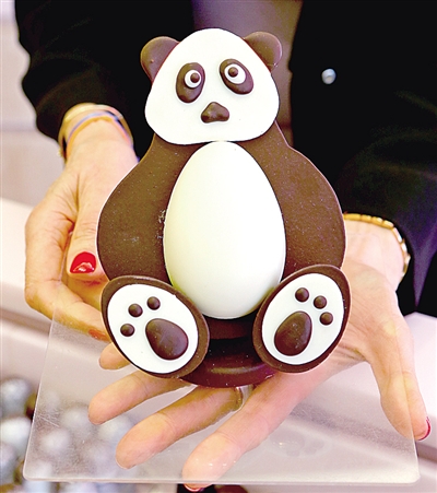 4月初,在比利时首都布鲁塞尔一家甜点店,店主在展示熊猫造型的巧克力。这家商店推出熊猫造型的马卡龙和巧克力等甜点,受到顾客欢迎。 新华社发