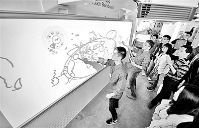 4月11日,参展企业工作人员在一款电子互动教学板前为观众进行演示。当日,2014年中国(南京)国际教育装备及科教技术展暨科学仪器及实验室装备展在南京国际展览中心开幕,20多个国家和地区的430家企业参展。 新华社记者 孙 参摄