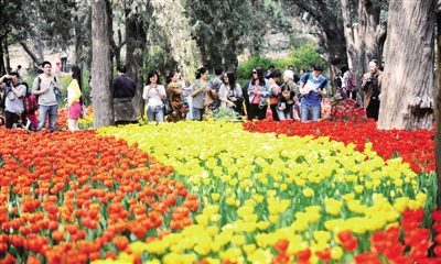 4月13日,游客在北京中山公园观赏郁金香。中山公园春花暨郁金香展展出的100余个品种、37万株郁金香近日竞相开放,吸引众多游人前来赏花踏青。