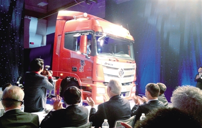 由中国福田汽车集团、德国戴姆勒、美国康明斯公司联手打造的欧曼GTL超能版载重汽车日前在美国印第安纳州哥伦布市康明斯技术研发中心举行发布仪式,基于欧洲标准设计,针对欧美高端市场定向开发的节能环保高端重卡,排放达到欧六标准。这是中国载重汽车自主品牌首次进军全球高端市场。 本报记者 张 伟摄影报道