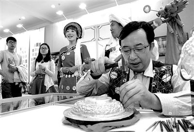 云南大理白族文化周4月12日在北京开幕。图为云南大理白族非遗产品展示厅,参观者正在欣赏具有民族风格的各种白族手工艺品。