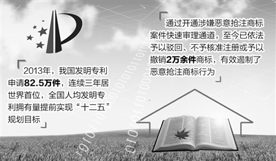 据统计,2013年,我国受理专利申请237.3万件,授权专利131.3万件。从2011年起,我国发明专利申请受理量跃居世界第一位。截至2013年底,我国(不含港澳台)每万人口发明专利拥有量达到44.0件,提前2年完成“十二五”规划的3.3件的目标。