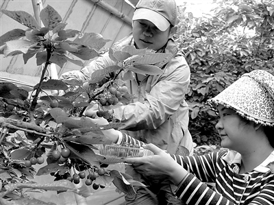 4月14日,在新疆生产建设兵团十三师农科所的实验大棚,一株株3米多高的美国大樱桃树挂满了果实,吸引不少游客前来采摘。农技人员介绍说,一座大棚种植150棵樱桃树,销售额可达14万元。