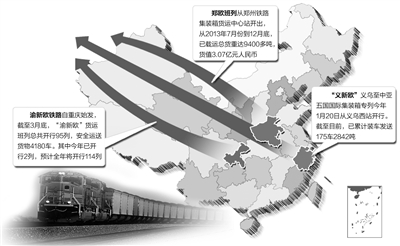 今年1月20日,“义新欧”义乌至中亚五国国际集装箱专列从义乌西站开行。浙江义乌直达中亚欧洲的国际铁路联运物流大通道基本建成。截至目前,上海铁路局金华货运中心已累计装车发送175车2842吨。