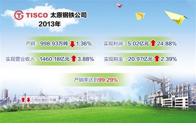 今年一季度,太原钢铁公司利润与去年同期相比稳中有升,位居行业前列,依然保持钢产量下降、收入利润增长的势头。记者从太钢集团“晒”出的2013年财报上看到:全年产钢998.93万吨,比上年下降1.36%;实现营业收入1460.18亿元,比上年增长3.88%;实现利润5.02亿元,比上年增长24.88%;实现税金20.97亿元,比上年增长2.39%。钢产量下降,营业收入、利润等指标却实现增长,降与升之间勾勒出太钢产业转型升级的曲线图。