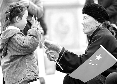 4月11日,山东省滨州经济开发区里则街道办事处敬老院组织老人来北京旅游,该院现有五保老人121人,全部由政府出资供养。图为北京天安门广场上,五保老人张玉兰与小游客交谈。