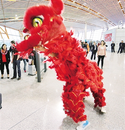 4月17日,在北京首都国际机场,演员为从夏威夷飞抵的游客表演舞狮。当日5时55分,从夏威夷火奴鲁鲁国际机场直飞北京的客机抵达北京首都国际机场,标志着美国夏威夷航空公司正式开通火奴鲁鲁直飞北京的航班。 新华社发