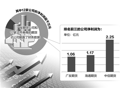 据不完全统计,目前23家上市券商中有12家披露了旗下期货子公司的财务数据,另外,广发期货公司也披露了2013年年报。在13家公司中,有12家公司净利润超千万元,排名前三的分别为中信期货、海通期货、广发期货,净利润分别为2.25亿元、1.17亿元、1.06亿元。