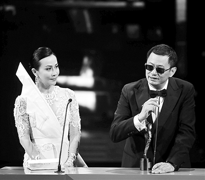 4月13日,凭借《一代宗师》获得最佳导演奖的王家卫(右)在颁奖典礼上。当晚,第33届香港电影金像奖颁奖典礼在香港文化中心举行。