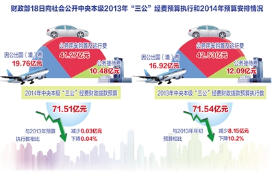 本报北京4月18日讯 记者崔文苑 曾金华报道:财政部18日公开今年中央本级“三公”经费预算安排情况显示,2014年中央本级“三公”经费财政拨款预算71.51亿元,这一数据与去年执行数略有下降,比去年年初预算减少8.18亿元,下降10.3%。