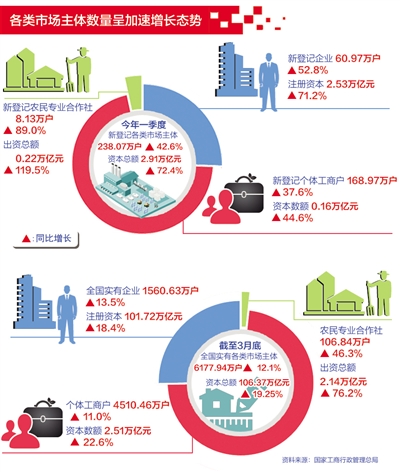 作为经济增长的先行指数,企业景气指数代表了市场主体对自身经营状况的判断,能够综合反映经济运行状况和未来预期走向。一季度工业企业景气调查结果表明,市场主体特别是实业界对未来经济增长仍然充满信心。联系此前国家工商总局发布的一季度市场主体数量统计数据,不仅市场主体数量增加较快,注册资本增量也十分可观。不难发现,制度改革已然唤醒民间的创业激情,营商环境改善正在得到市场的响应。当前,经济的活跃度在增强,经济向上的力量在增强,经济增长的潜力也在增强,市场主体对未来经济发展的前景有着明确而积极的预期。所以,虽然当前经济增速有所放缓,但只要市场主体信心不减,对中国经济的未来表现就不必过于担心。