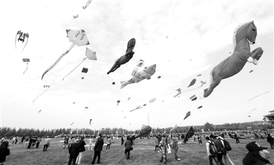4月19日,各式风筝飞翔在山东省潍坊市浮烟山国际风筝放飞场。当日,第三十一届山东潍坊国际风筝会在潍坊市浮烟山国际风筝放飞场举行。张 驰摄(新华社发)