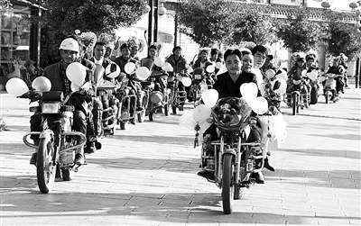 在云南永仁县永定镇,彝族的新郎新娘一般等生了孩子后才举办婚礼。彝族婚礼,接亲传统是骑马,但现在接亲改骑摩托。接亲队伍是由伴郎伴娘组成,彝族伴郎伴娘的数量比较有意思,伴娘必须是伴郎的双倍。如果伴郎有8人,伴娘就要有16人。 殷必聪摄