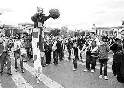 4月19日,在匈牙利首都布达佩斯的英雄广场,布达佩斯大马戏团的小丑参加游行活动,庆祝世界马戏日。 新华社发