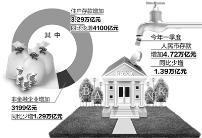 央行日前公布的数据显示,今年一季度,人民币存款增加4.72万亿元,同比少增1.39万亿元,增长速度明显放缓。其中,住户存款增加3.29万亿元,非金融企业存款增加3199亿元,分别比去年同期少增4100亿元和1.29万亿元。存款增长为何放缓,又是什么原因导致企业存款少增规模明显高于居民存款?
