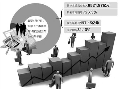 截至4月17日,19家上市券商中有14家已经公布2013年年报,累计实现营业收入6521.87亿元,较去年同期增长26.3%;净利润达到197.15亿,同比增长31.13%。
