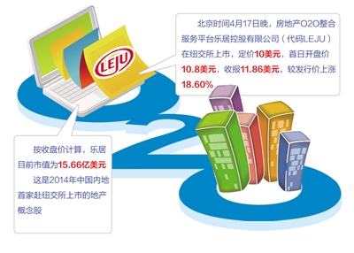 北京时间4月17日晚,房地产O2O整合服务平台乐居控股有限公司(代码LEJU)在纽交所上市,定价10美元,首日开盘价10.8美元,收报11.86美元,较发行价上涨18.60%。按收盘价计算,乐居目前市值为15.66亿美元。这也是2014年中国内地首家赴纽交所上市的地产概念股。