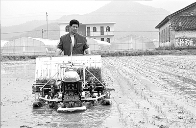 4月18日,江西崇仁县相山镇枫上村的种粮大户袁志华正在机插秧苗。地处丘陵的崇仁县机插成亮点,水稻农机综合作业水平达到70.2%,机插率达到32%,高于全省平均水平14.5个百分点,有两个村的机插率高达95%。 陈胜孙摄