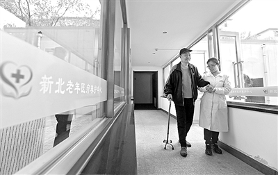 4月21日,养护中心护士何骥搀扶一位老人散步回来。日前,辽宁沈阳首家医疗型养老机构——新北老年医疗养护中心开门迎客。该中心最突出的特点就是实行“养老院+医院”的服务模式。养护中心与几家合作医院对接,为患病老人进行会诊和转院治疗。