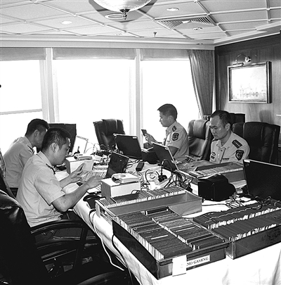 4月14日,时隔6年后首次复航的邮轮“处女星号”从香港抵达三亚,海南三亚边防检查站为来自30个国家、1600余名旅客船员提供了高效、优质、安全的通关服务。图为边检干警在邮轮上查验船员证件。 王 静摄