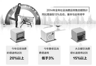 商务部研究院22日发布的《2014年消费市场发展报告》显示,2014年全年社会消费品零售总额增速预计基本与去年持平,同比增速在13%左右。今年消费市场的最大特点是在较低增速下,实现消费发展模式的重大转型,从而为长期的消费平稳增长和消费再次崛起为经济增长的第一拉动力打下更坚实的基础。