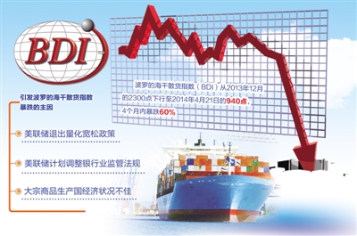 波罗的海干散货指数(BDI)从2013年12月的2300点下行至2014年4月21日的940点,4个月内暴跌60%。作为衡量国际海运市场的权威指数,BDI主要体现了全球大宗商品的需求状况,其走势也深受全球大宗商品市场变化影响。分析人士认为,美联储退出量化宽松政策、美联储计划调整银行业监管法规,以及大宗商品生产国经济状况不佳这“三座大山”,是引发此轮波罗的海干散货指数暴跌的主因。