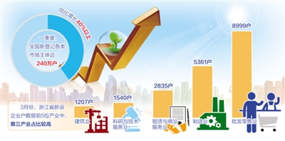 更重要的是,改革促使市场主体结构得到有效改善,新登记企业中第三产业企业所占比重进一步加大。以浙江省为例,居3月份全省新设企业户数前5位的分别是:批发零售业8999户、制造业5361户、租赁与商业服务业2835户、科研与技术服务业1540户、建筑业1207户,第三产业占比明显超过第一、第二产业。从增幅看,信息传输、软件和信息技术服务业,科学研究和技术服务业,租赁和商务服务业新登记企业同比增幅分别为128.6%、98.8%和76.1%,增幅远高于企业平均增速。“这显示出改革对第三产业特别是信息、科技类新兴产业的带动作用尤为明显。”浙江省工商局局长裘东耀说。
