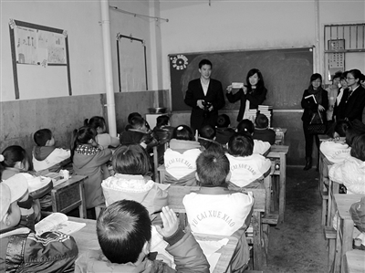 浙江台州银监分局“送金融知识进义务教育体系”活动走进育才农民工子弟小学。图为台州分局工作人员向小学生现场讲解金融知识。 姚 兰摄