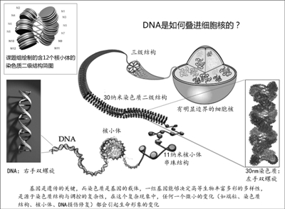 每个人类细胞的细胞核中都有一条DNA,每条DNA上都含有人类基因组的30亿个碱基对。一条DNA“绳子”展开可达2米,却要安放在直径只有几个微米(一米等于一百万微米)的细胞核里,就不得不以某种方式绕成“线团”。