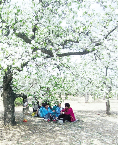 清明刚过,记者乘公交车前往梨花村。上车一打听,一车人大半是去梨花村的。63岁的市民吕爱珍告诉记者,连续4年都和朋友前往梨花村看梨花,这里交通方便,从南城坐公交车1个多小时就到。下车后,传说的梨园便展现在面前。朵朵梨花如飘落在树上的雪片,在湛蓝的天空下,格外耀眼,把梨乡打扮得分外妖娆。梨园的大,梨花的美,令人流连。面对美景,有的人不停地走,见梨花就拍照,走累了直接铺张纸席地而坐,聊天嬉戏。有的人直接在树下搭起帐篷躺下,阳光透过花簇照进来,宁静惬意。