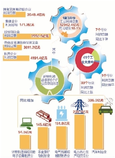 利润是企业追求的首要目标,有利润的增长才是有质量的增长。但2013年10月以来,受需求疲弱和产能过剩影响,我国规模以上工业企业实现利润增速持续走低。今年1至2月份,全国规模以上工业企业实现利润总额同比只增长9.4%,增速比上年全年回落2.8个百分点。企业一度对此非常担忧。所幸3月份实现利润总额5131.6亿元,同比增长10.7%,增速比1至2月份提高1.3个百分点。