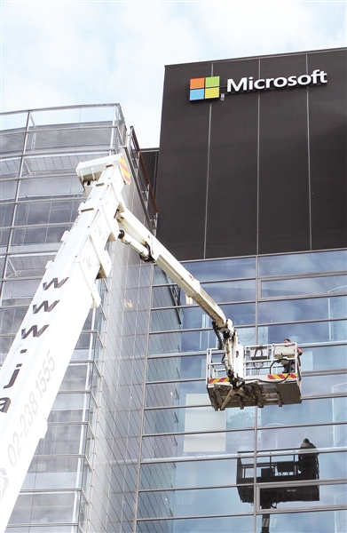 4月26日,在芬兰埃斯波市,工人在原诺基亚总部大楼外墙安装微软的标志。芬兰通信公司诺基亚25日宣布完成向微软出售设备与服务部门的业务。至此,这项历时近8个月,总额达50多亿欧元的交易最终尘埃落定。 新华社发