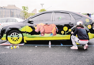 4月27日,动漫爱好者在车身上画上动漫主题元素。当日,“私家车动漫彩绘大赛暨巡游活动”在杭州举办,100名私家车主和众多动漫彩绘爱好者共同把美猴王、葫芦娃、阿童木、喜羊羊等中外知名的动漫主角画在了车身上。 新华社记者 徐 昱摄