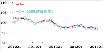 进一步剔除随机因素,一季度中经有色金属产业景气指数为96.8(见中经有色金属产业景气走势图中的蓝色曲线),比未剔除随机因素的有色金属产业景气指数(见红色曲线)低0.3个点。这表明政策性等外部因素对于行业影响趋于中性。