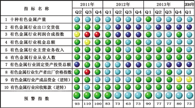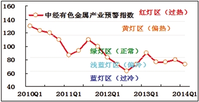 2014年一季度,中经有色金属产业景气指数为97.1,比去年四季度下降0.4个点;中经有色金属产业预警指数为73.3,比去年四季度下降6.7个点,继续在“浅蓝灯”区运行。