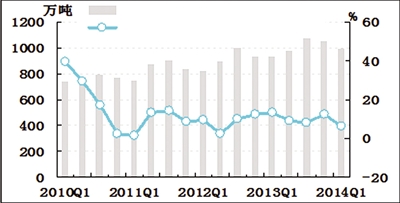 经初步季节调整,一季度我国十种有色金属产量为990.8万吨,同比增长6.1%,增速比去年四季度下降4.3个百分点。