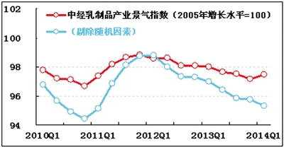 2014年一季度,中经乳制品产业①景气指数为97.5(2005年增长水平=100),比去年四季度上升0.4点,经历了过去4个季度的逐季下降后,本季度有所回升。