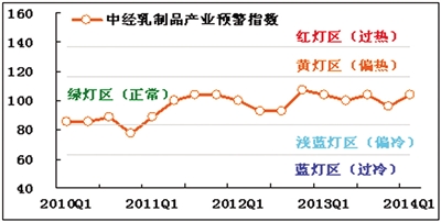 2014年一季度,中经乳制品产业景气指数为97.5,比去年四季度上升0.4点。一季度中经乳制品产业预警指数为103.7,比去年四季度上升7.4点,运行在“绿灯区”中心线之上。