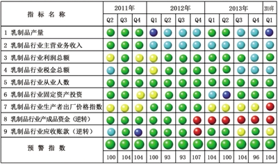 一季度,在构成中经乳制品产业预警指数的9个指标(仅剔除季节因素,保留随机因素)中,位于“绿灯区”的有3个指标—乳制品行业利润总额、从业人数和固定资产投资;位于“红灯区”的有2个指标—乳制品行业生产者出厂价格指数和产成品资金(逆转);位于“黄灯区”的有1个指标—乳制品行业应收账款(逆转);位于“浅蓝灯区”的有2个指标—乳制品行业主营业务收入和税金总额;位于“蓝灯区”的有1个指标—乳制品产量。