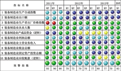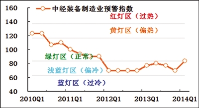 2014年一季度,中经装备制造业景气指数为95.9,与去年四季度基本持平;中经装备制造业预警指数为83.3,比去年四季度回升13.3点,由偏冷的“浅蓝灯区”上升至正常稳定的“绿灯区”。