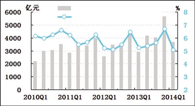 一季度装备制造业的销售利润率为5.0%(全部工业销售利润率为5.2%),比去年同期略低0.2个百分点。