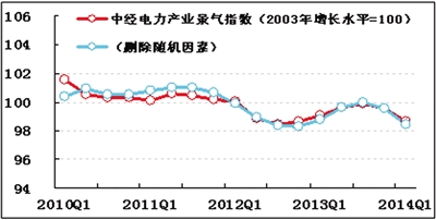 2014年一季度,中经电力产业①景气指数为98.7(2003年增长水平=100),比去年四季度下降0.9点,降幅较上季度扩大0.6点。