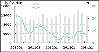 经初步季节调整③,一季度发电量为11871.6亿千瓦小时,同比增长5.5%,增速比去年四季度回落2.9个百分点,连续两个季度增长趋缓。