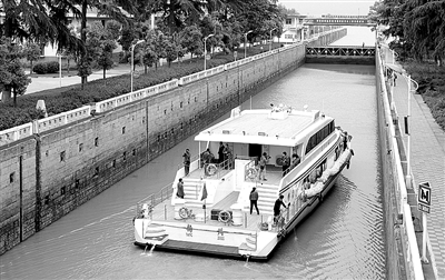 4月28日,负责旅游专线运输任务的“运河名城1号”游轮通过京杭大运河邵伯船闸。当日,江苏省扬州市正式开通京杭大运河“扬州-邵伯-高邮”水上旅游专线,全程约45公里。 郁 兴摄(新华社发)