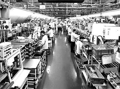 爱信(天津)车身零部件有限公司的车间工人正在加工车身零部件。在2014(第十三届)北京国际汽车展览会上,爱信集团带来商用车混合动力自动变速箱等节能环保技术和产品。 本报记者 陶 玙摄