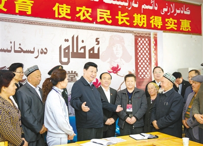 随后,习近平来到疏附县托克扎克镇阿亚格曼干村,视察了村委会,了解村级组织运转和开展便民服务情况。村干部向总书记介绍,村里经济发展、村民增收等各项工作都抓得很紧,还举行了一些特色文化活动,乡亲们和谐相处,治安也很好。习近平高兴地说,你们的实践说明,社会主义新农村建设的道路是宽广的,祖国边疆的发展前景是美好的。
