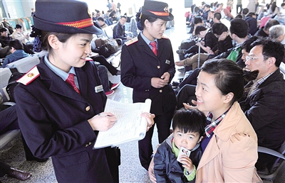 | ⬅上海铁路局镇江南站客运员在为旅客服务。铁路职工常年坚守在一线,用默默奉献诠释着“劳动最光荣”。 |