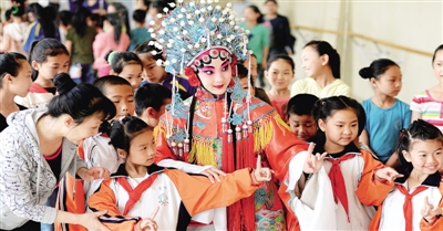 | 河北保定南市区艺校戏曲班学生刘瑞雪(中)正在指导红星路小学的学生学唱戏曲。该区深入开展“家乡文化进校园”活动,通过编写五册文化读本、聘请文化志愿者、课堂搬到文保单位等形式,使家乡文化植入孩子心中。 |