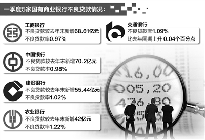 从一季报情况看,5家国有大行不良贷款出现分化。其中,中行一季度新增不良贷款大幅上升,较去年末新增70.2亿元,增幅接近该行2013年全年新增不良贷款额9成。同时,不良贷款率也从去年末的0.96%上升至0.98%,达803.20亿元。