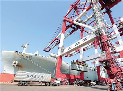 由中国远洋运输集团开通的国内运距最长的集装箱天天班航线营口港至广州南沙港天天班,成为南北海上运输新的大通道,对降低物流成本,促进南北经济发展起到了重要作用。今年1至4月,全航线增量同比达到36%,再创海运集装箱天天班增长率全国第一。图为营口港繁忙的作业码头。